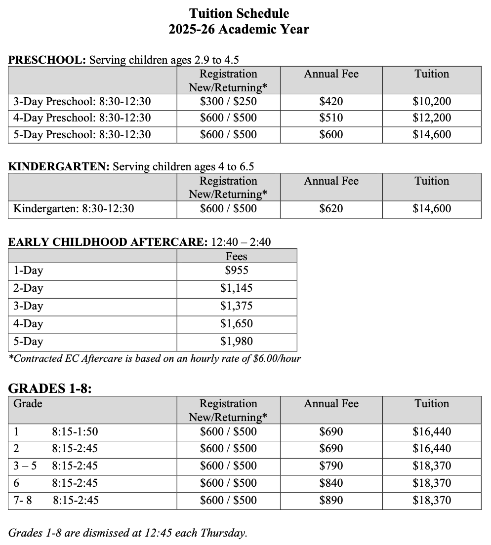 *The Returning student registration fee due on or before Feb. 21 is listed above. After Feb. 21, the returning student registration fees are $375 for 3-day preschool and $750 for 4-day Preschool through Grade 8. Registration fees are non-refundable. See the enrollment agreement for details.
